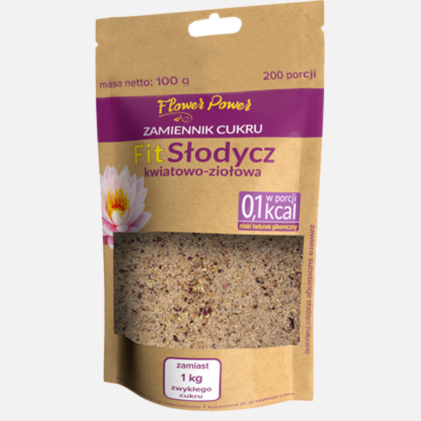 Fit Cukier kwiatowo-ziołowy to naturalny produkt, którego składnikami są płatki kwiatów, do słodzenia na zimno i na ciepło. Doskonały w diecie niskokalorycznej, wegańskiej, oraz we wszystkich pozostałych dietach. Charakteryzuje się niskim indeksem glikemicznym: LG 1 porcji - 0,005 , 100 razy niższy od łyżeczki cukru. Jedno opakowanie zastępuje 140 łyżeczek tradycyjnego cukru.